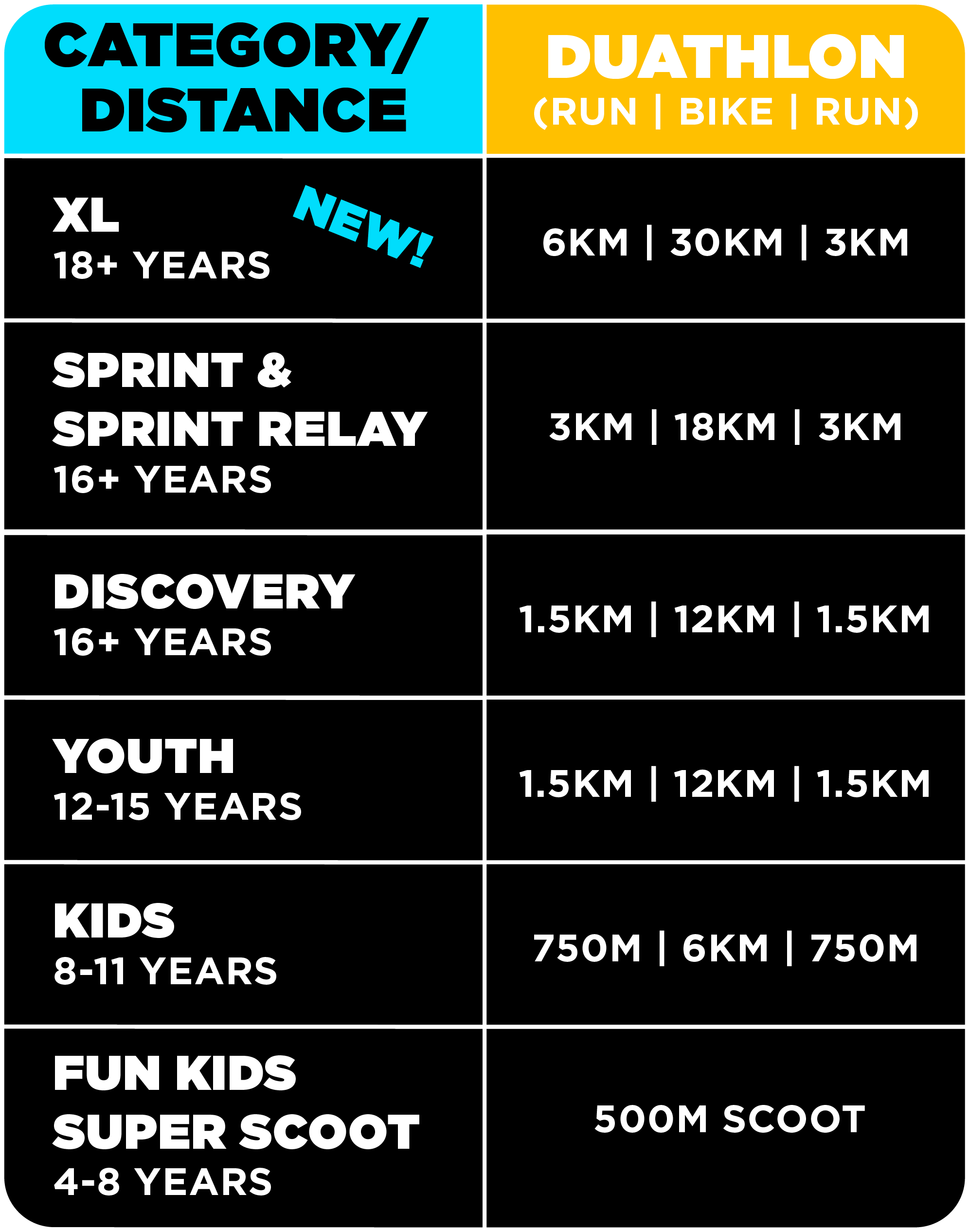 The duathlon offers distances for all ages and abilities. Adults and kids, elite athletes and newbies will be able to test their mettle! For (aspiring) triathletes, it’s the perfect bridge between the Aquathlon and Triathlon.