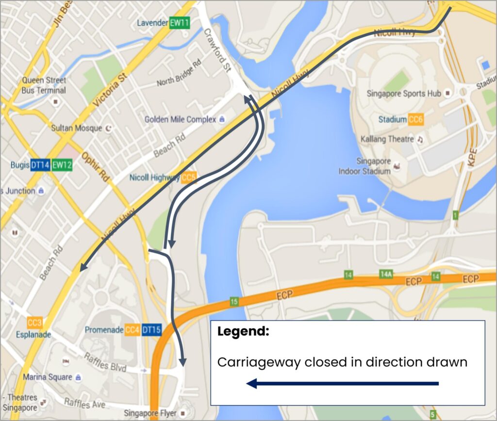 Republic Avenue, Republic Boulevard, and Nicoll Highway (towards Esplanade Drive).