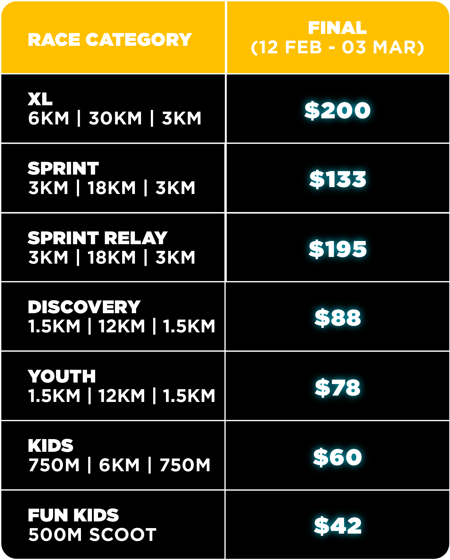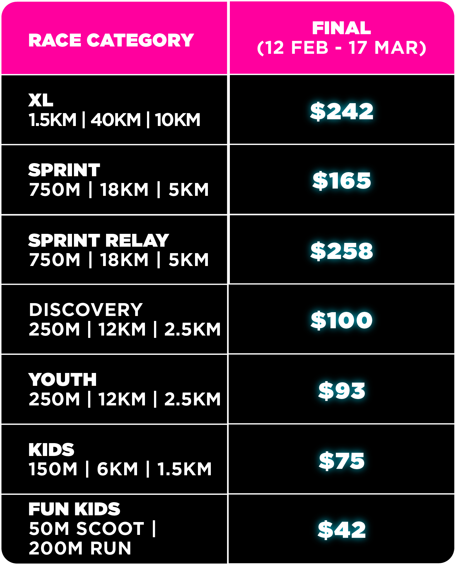 Secure your spot in the city’s popular Triathlon Series. Our entry fees are designed to be accessible for beginners while offering great value for seasoned athletes.